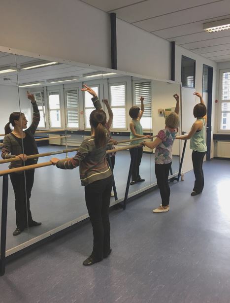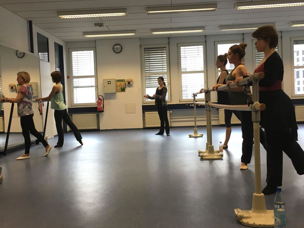 Die Ergebnisse können sich sehen lassen: Knapp eine Stunde wird an der Barre, der Ballettstange trainiert. Die Dozentin macht es vor, die Teilnehmerinnen tanzen die Übung selbstständig zur Musik nach. Gelegentlich gibt sie noch Hinweise: Ins Demi-plié, danach ins Grand-plié. Auch jetés und Grand battements sind Teil dieser Stunde (wer bei den Begriffen Hilfe braucht, dem haben wir hier ein Ballett-Glossar verlinkt: https://de.wikipedia.org/wiki/Ballett-Glossar 😉 ). In der Mitte des Raumes geht es dann weiter, um Drehungen und Sprünge zu üben. Die Übungen bereitet Alina Darscht zu Hause vor. Drei Wiederholungen gibt es von einer Stunde, damit man sich zuerst die Reihenfolge und dann auf technische Verbesserungen konzentrieren kann. Und das nutzen die Teilnehmerinnen voll aus. Schon vieles sitzt in dieser Stunde.