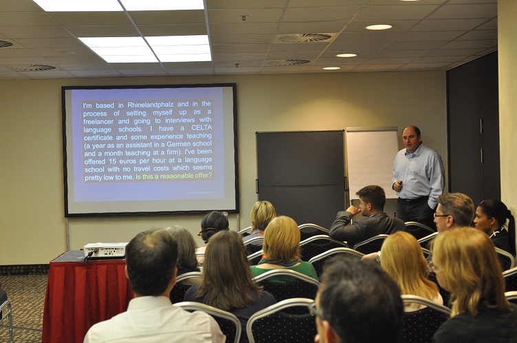 In seinen Kursen geht es vor allem um mündliche und schriftliche Kommunikation, ums Sprechen und Schreiben, Telefonieren und Korrespondenz. In seinem Fall noch viel spezieller um den Umgang mit Mandanten, um Telefonkonferenzen, Besprechungen, Schriftsätze, Stellungnahmen, Gutachten und Berichte. Es geht auch Fertigkeiten wie das Führen von Verhandlungen und das Halten von Vorträgen, wozu Anwälte, aber auch Steuerberater, immer wieder gebeten werden. Und es geht natürlich um Fachsprache, denn ohne das richtige Vokabular kann sich niemand ausdrücken. Kurzum: eine Mischung aus Konversation, Schreibtraining und intensiver Wortschatzarbeit.