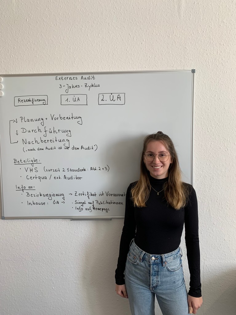 Und nun bin ich als Azubi in der VHS und unterstütze Frau Bruckmann nun seit fast drei Monaten bei ihrer Arbeit. Frau Bruckmann ist die QMB (Qualitätsmanagementbeauftragte) der VHS Düsseldorf und für das Feedback- und Qualitätsmanagement zuständig. Die Besonderheit im Aufgabenbereich Qualitätsmanagement ist es, dass man sowohl mit Kolleginnen und Kollegen, als auch mit unseren Kundinnen und Kunden im Austausch steht, um gemeinsam Verbesserungsvorschläge zu entwickeln und zu realisieren. Dieses Vorgehen macht mir sehr viel Spaß und wird nicht langweilig, da stets eine neue Idee darauf wartet, umgesetzt zu werden.