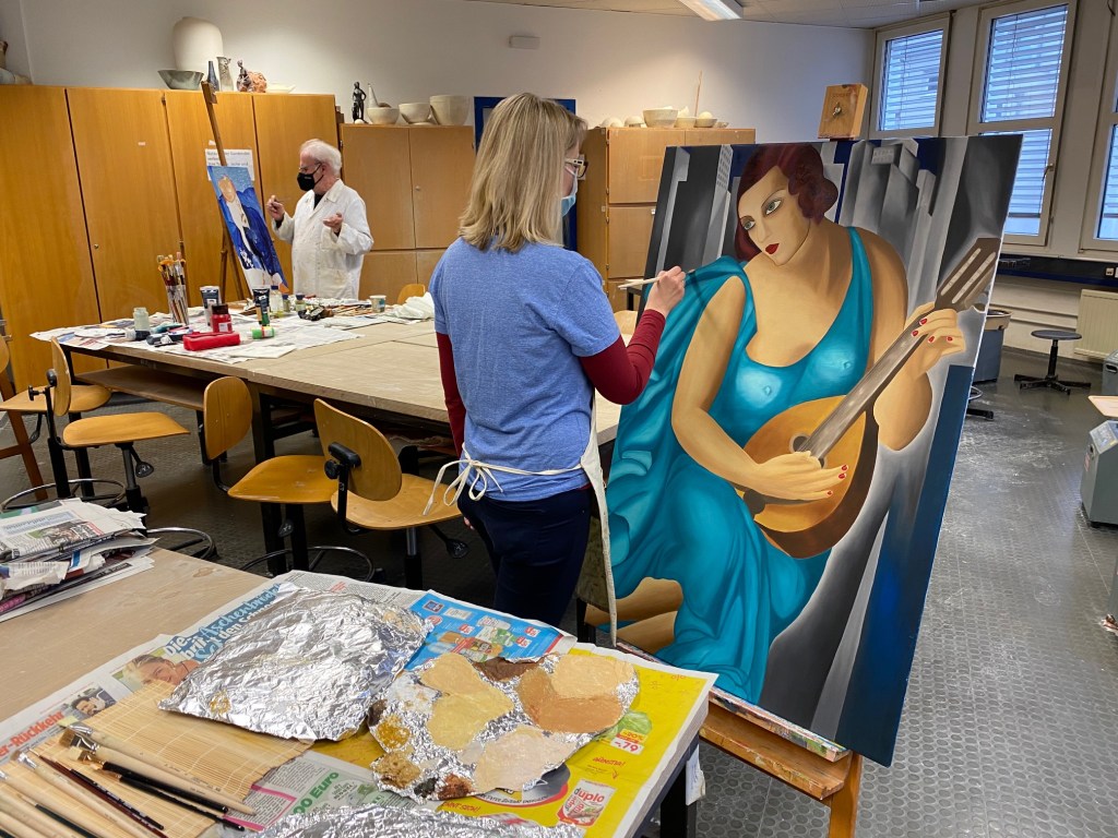 Mittlerweile fühlt Anna sich in ihrem Kurs richtig wohl und angekommen. „Der Austausch mit den anderen Teilnehmenden tut unheimlich gut“, sagt sie. „Wir sprechen über Techniken und bauen uns gegenseitig auf.“ Außerdem genießt Anna das Zusammenkommen mit Menschen, denen sie außerhalb der VHS sicherlich nie begegnet wäre. Ihr Kurs ist kunterbunt, vom Rentner über den Schreiner bis zum Weinhändler. Anna selbst ist wissenschaftliche Hilfskraft an der Uni, zudem Studentin und Mutter. Den Malkurs empfindet sie wie einen kleinen Urlaub. Fernab vom Uni-, Arbeits-, Haushalts- und Familienstress kann sie hier ganz bei sich und ihrem Bild sein. Konzentration pur.