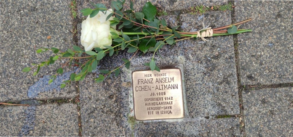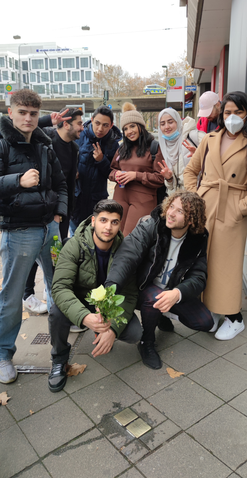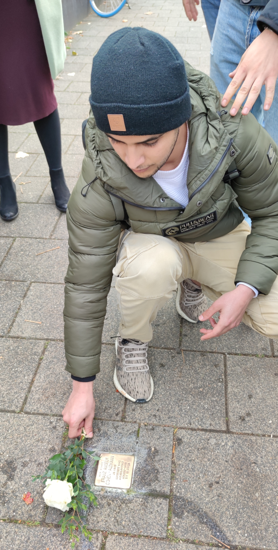 Mittlerweile hat die Schulische Weiterbildung ihre Räumlichkeiten in Golzheim. Da lag es nahe, sich mit den Stolpersteinen in der neuen Umgebung zu beschäftigen. Im Rahmen ihres Geschichtsunterrichts besuchten Teilnehmende auf ihrem Weg zum Hauptschulabschluss nach Klasse 9 Stolpersteine auf der Kaiserserwerther Straße und der Cecilienallee. Sie erfuhren die Schicksale der Menschen und setzten sich mit deren Lebensgeschichte auseinander. Einige von ihnen fanden Parallelen zu ihrer eigenen Flucht- und Migrationsgeschichte und waren entsprechend gerührt.