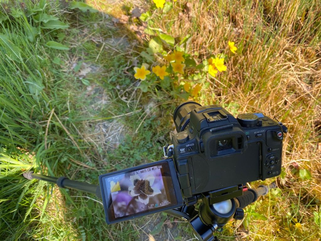 Die knallgelbe Sumpfdotterblume erscheint in Bienenaugen beispielsweise zweifarbig, und zwar bienengrün und -purpur, wie Professor Lunau anhand der Falschfarbenfotografie veranschaulicht. Dafür fotografiert er die Blüte mit einem speziellen Filter, der nur das UV-Licht durchlässt.