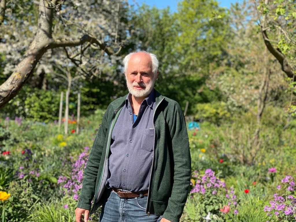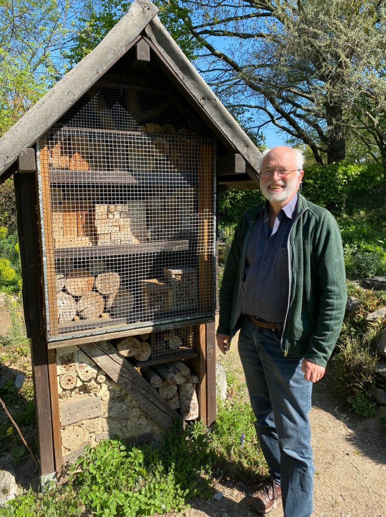 Unser Gespräch findet – natürlich – im VHS- Biogarten statt. Gerade entfaltet die Vormittagssonne ihre Kraft. Vögel zwitschern und um uns herum summt und surrt es. Professor Lunau kennt den Biogarten gut. Vor Jahren ist er aufgrund der Nähe seines Arbeitsplatzes an der Heinrich-Heine-Universität zufällig auf ihn gestoßen. Auch wenn er mittlerweile im Ruhestand ist, besucht er ihn noch regelmäßig. Und vermittelt in Führungen gerne sein Bienenwissen. Ihm ist es wichtig, die kommenden Generationen für die Folgen der rückläufigen Bestäubung und des Klimawandels zu sensibilisieren. Die nächste Führung ist am 2. Juli und trägt den Titel „Mit Wildbienen im VHS-Biogarten“ (Y640 700).