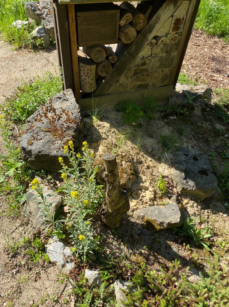 Die Wildbienen sind, anders als die Honigbiene, stark gefährdet. Daher ist es wichtig, ihr Nahrungsquellen und Nistmöglichkeiten zu bieten. Viele Gartenbesitzer haben bereits sogenannte Insekten- oder Bienenhotels in ihren Gärten stehen – auch wir im VHS-Biogarten. Diese mit zahlreichen Hohlräumen versehenen Konstruktionen werden von einigen Bienenarten wie der Gehörnten Mauerbiene auch gut angenommen. Doch mehr als die Hälfte aller Wildbienenarten in Deutschland ist bodennistend und bevorzugt selbstgegrabene Gänge. Daher wurde hinter unserem Bienenhotel eine kleine Hügellandschaft aus bindigem Sand erschaffen, die – wie wir bei unserem Besuch feststellen konnten – unter anderem von einer kleinen Sandbiene bewohnt wird. Doch nicht nur die Nisthilfen ziehen die fleißigen Insekten an. Die vielfältige Blütenpracht des Biogartens trägt dazu bei, dass die Bienen reichlich Nahrung finden und somit während ihrer Futteraufnahme die für Tausende Blütenpflanzen überlebensnotwendige Bestäubung vornehmen.
