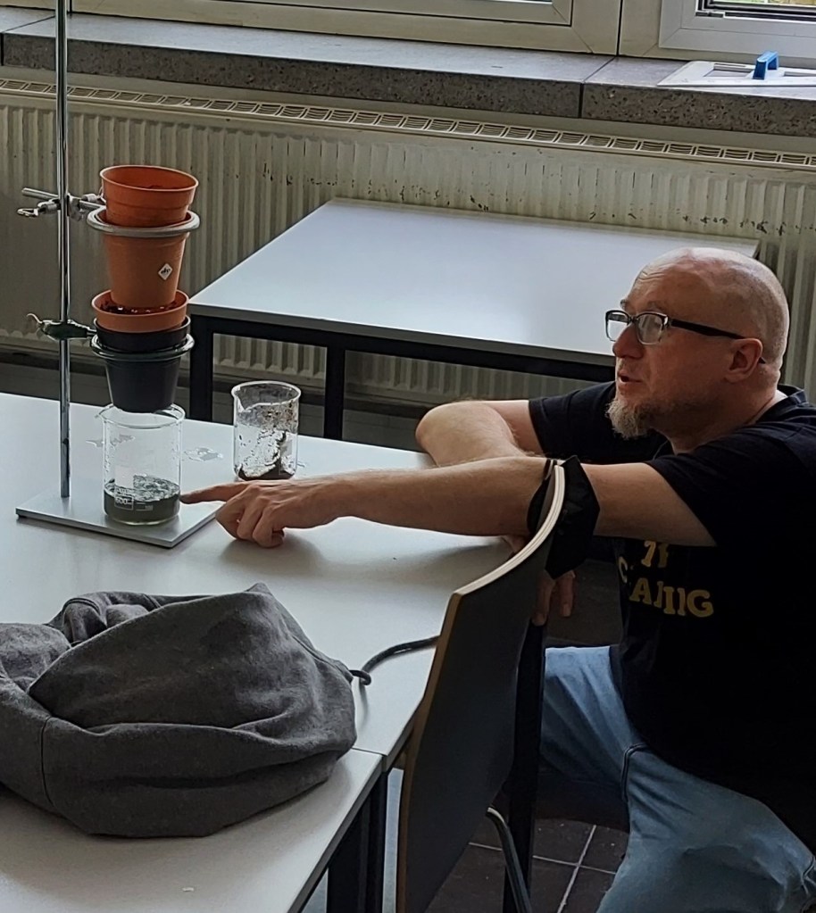 Ein weiteres Thema war der Umgang mit unserem Lebenselixier Wasser. Wie wird Trinkwasser aufbereitet? Was geschieht im Klärwerk? Und wie groß sind eigentlich die weltweiten Wasserressourcen? Nach einer zunächst theoretischen Einführung konnten die Teilnehmenden anhand eines von ihnen gebauten Modells erleben, auf welche Weise Wasser gereinigt werden kann.