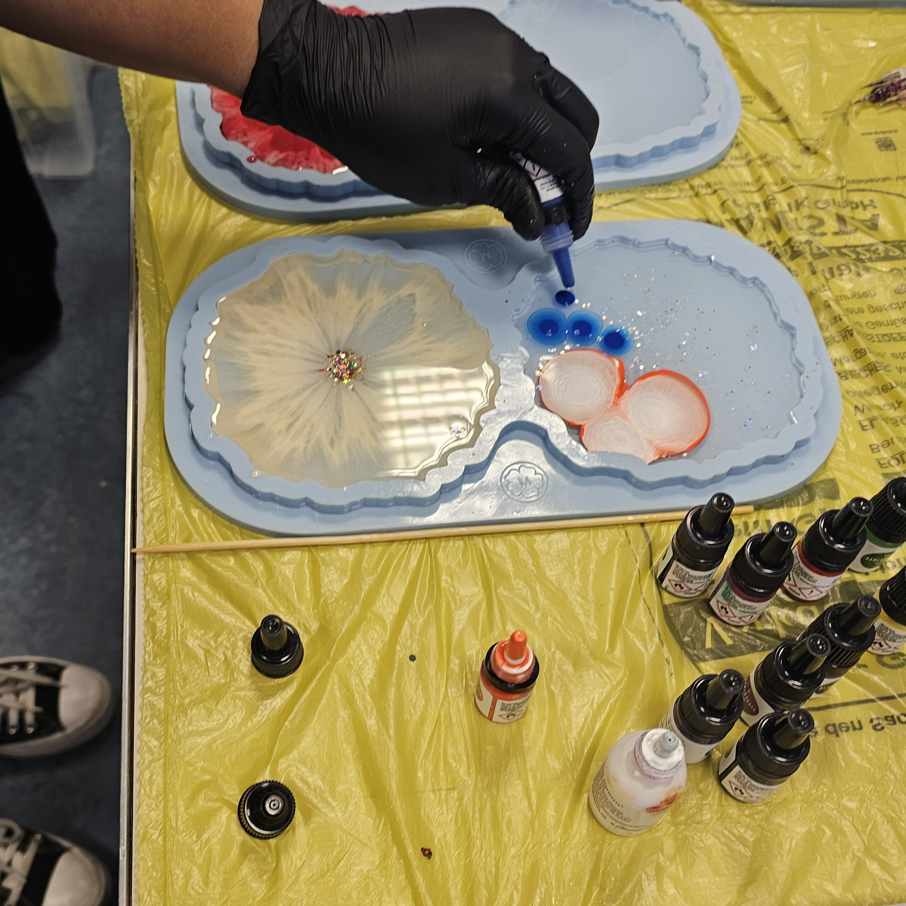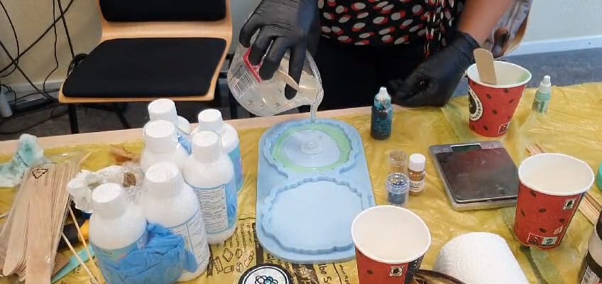 Zunächst gibt es eine kleine Sicherheitseinführung, denn wir arbeiten ja mit einer Chemikalie. Daher tragen wir Handschuhe und eine Maske. Und als Schutz für die Kleidung empfehle ich eine Schürze. Dann informiere ich allgemein über Epoxidharze, von denen es viele Varianten gibt. Es folgt ein praktischer Teil, in dem ich vier bis fünf Techniken vorführe. Die Teilnehmenden können dann spontan entscheiden, welche sie anwenden möchten. Glitzer, Steinchen und Farben stelle ich im Kurs zur Verfügung. Auch da kann dann jeder frei wählen.