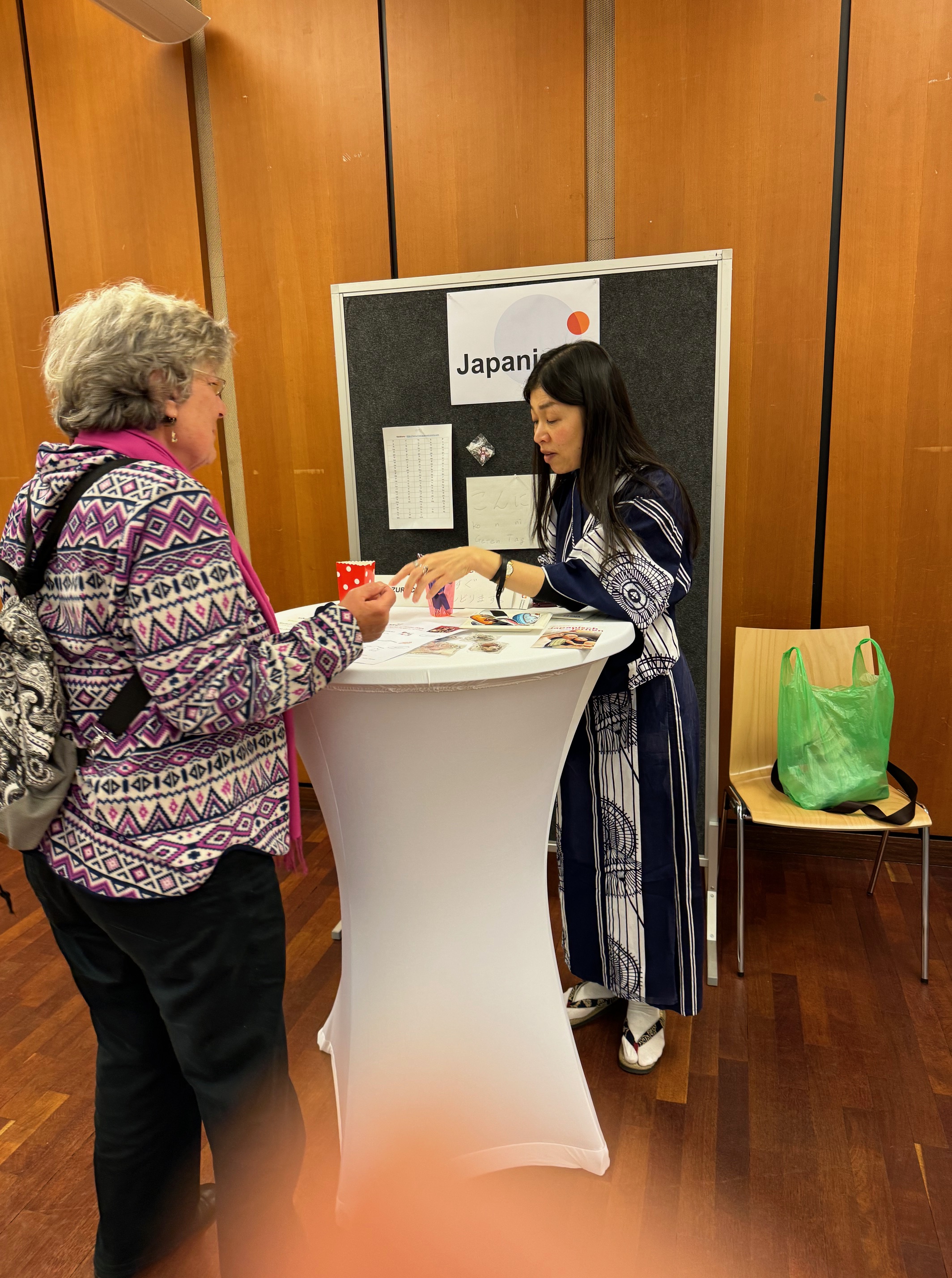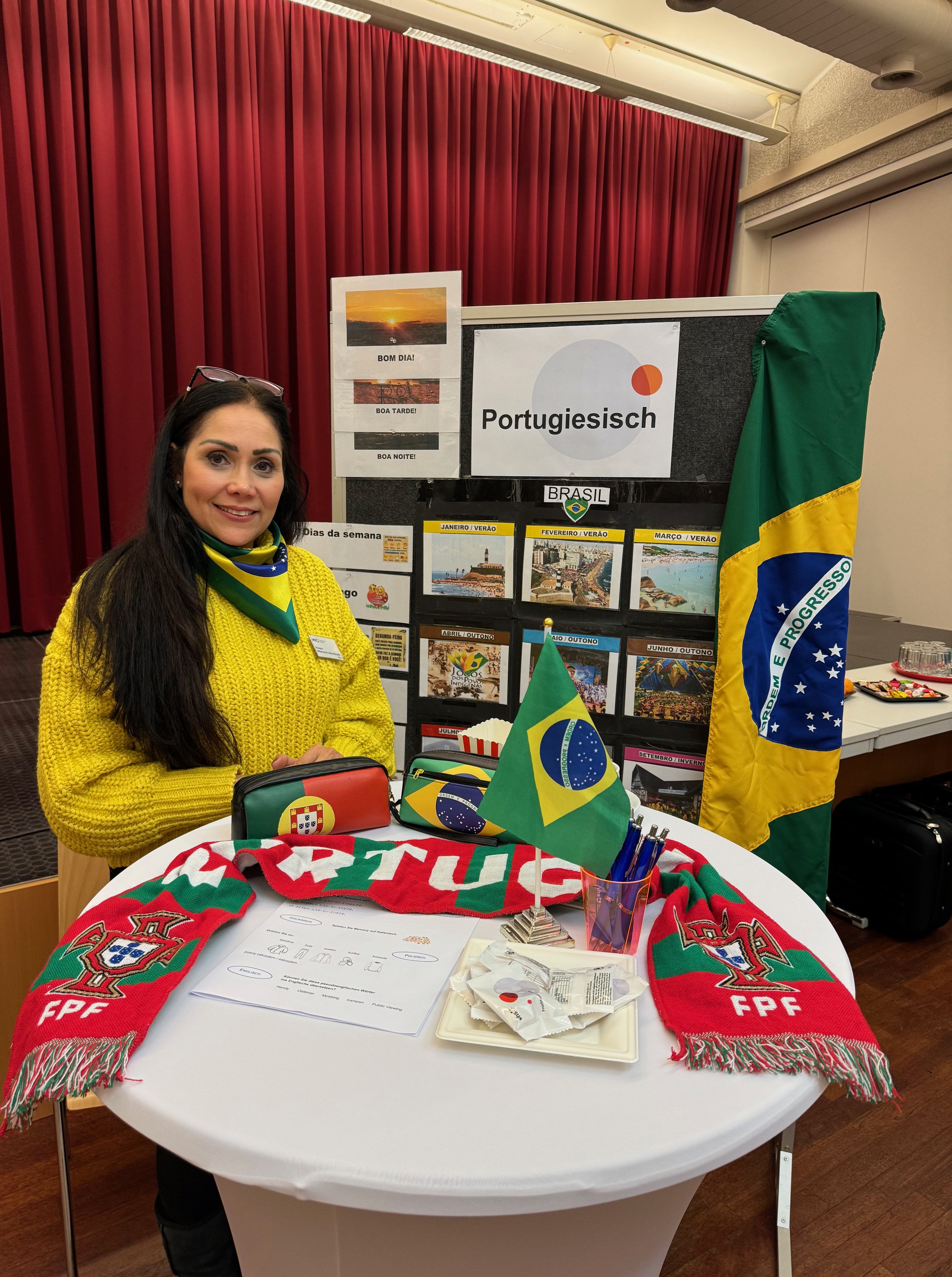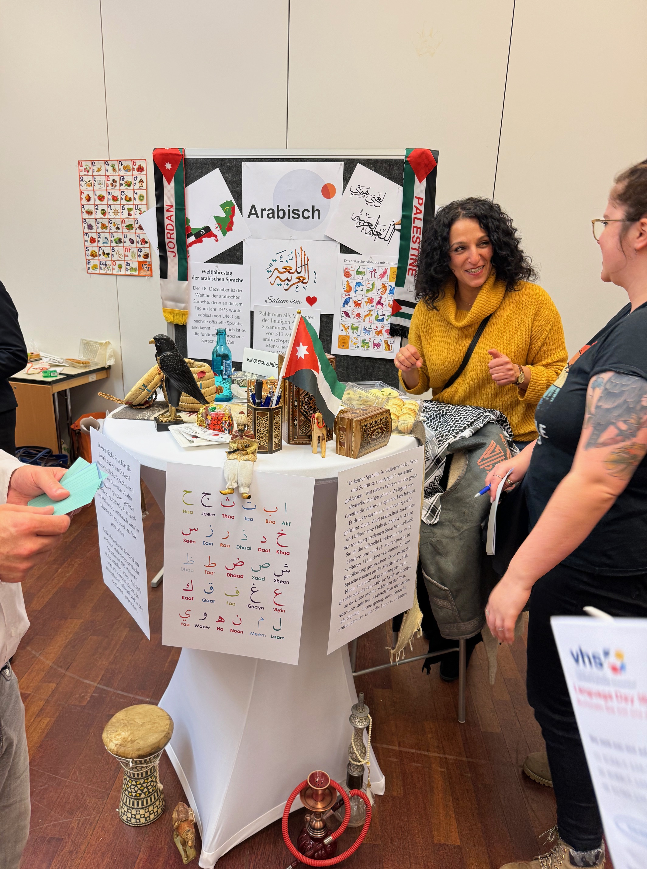 Am 18. November hat unser Sprachentag/Language Day Premiere gefeiert – und viele von euch waren dabei! Der große Saal im Erdgeschoss unseres Gebäudes am Bertha-von-Suttner-Platz 1 hat sich dafür in einen bunten Markplatz der Sprachen verwandelt. Das Stimmengewirr reichte von Armenisch über Hindi bis Schwedisch. Insgesamt waren 20 unserer 37 angebotenen Sprachen vertreten. An teils liebevoll, mit landestypischen Accessoires geschmückten Stehtischen standen unsere Dozierenden Rede und Antwort. Eine Rallye mit kleinen Aufgaben und Fragen machte es den Besuchenden leicht, an den Tischen ins Gespräch zu kommen.